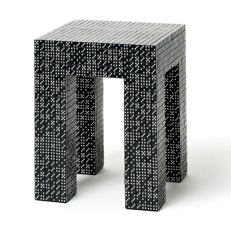Schneemann not only seeks answers to these questions, but also attempts to seize luck and turn them into furniture. His method is simple, yet unusual: he piles up thousands of dice in his studio and puts them to work; but only those he rolls sixes with are used later. In his mind, only the sixes, the dice that hold good luck, are worthy of being used as building blocks (with the six on top) to create a table, a mirror, a candlestick or any other object. And with these 'talismans' – imaginary or real, he not only creates a new aesthetic value, but also hopes to bring some luck into the lives of their new owners.
